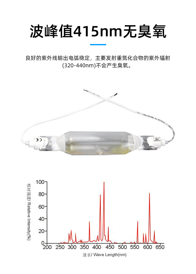 Processed Materials:波峰值415nm,光谱稳定,无臭氧,寿命1000小时