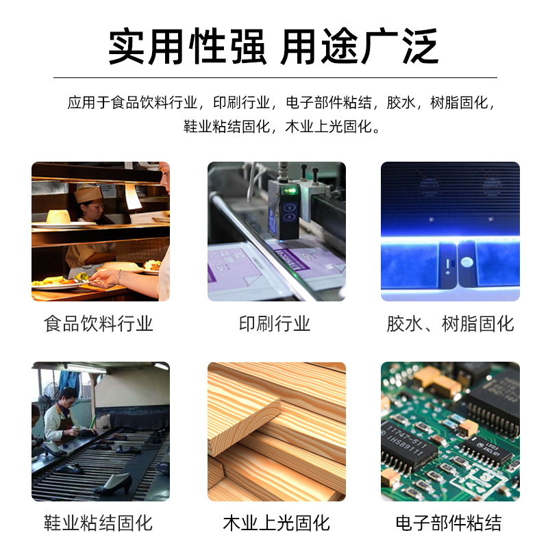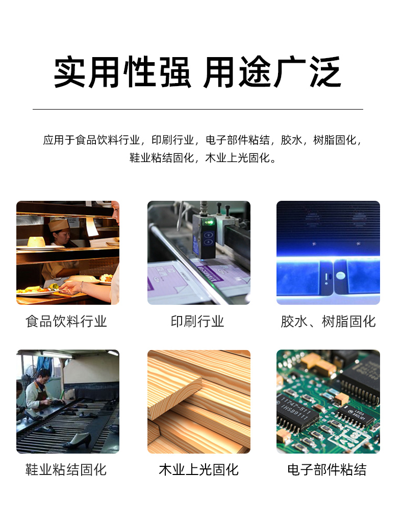 Applications:食品,印刷,电子部件,胶水/鞋业/木业固化等